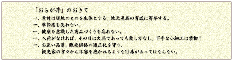 案には「海鮮丼」「回選丼」「おっけい丼」「頼朝御膳」「頼朝丼」「海鮮・山鮮料理」「俺我丼」などが提案されましたが、各店独自の商品開発という趣旨から、結論として「おらが丼」と言う統一ネーミングにすることになりました。