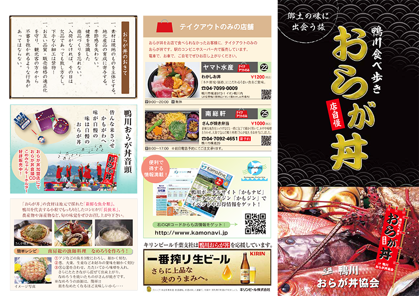 平成16年5月からスタートした地域振興対策委員会、食文化研究会も14回重ね開催した結果、今現在各店で使用している原材料に地場食材を一部使用して、それぞれの飲食店で独自の商品を創作していただき、「丼のまち鴨川」で推進して行くことに方向づけされました。