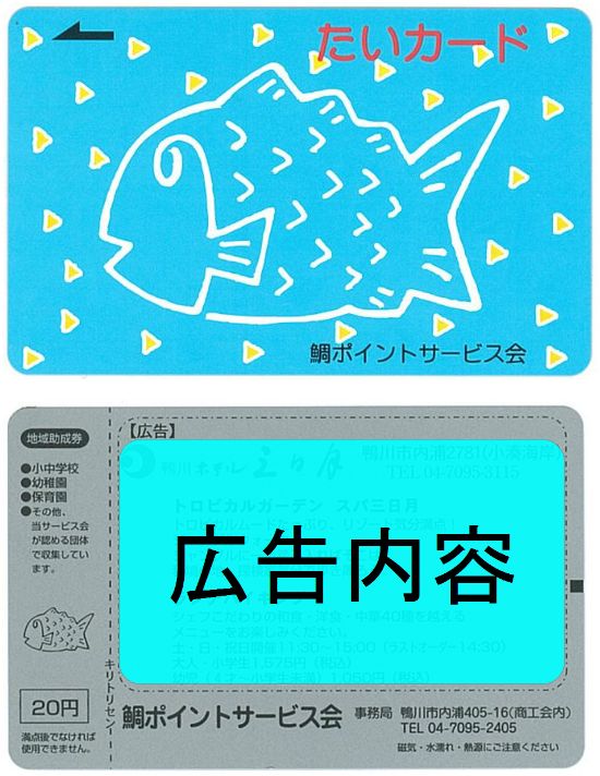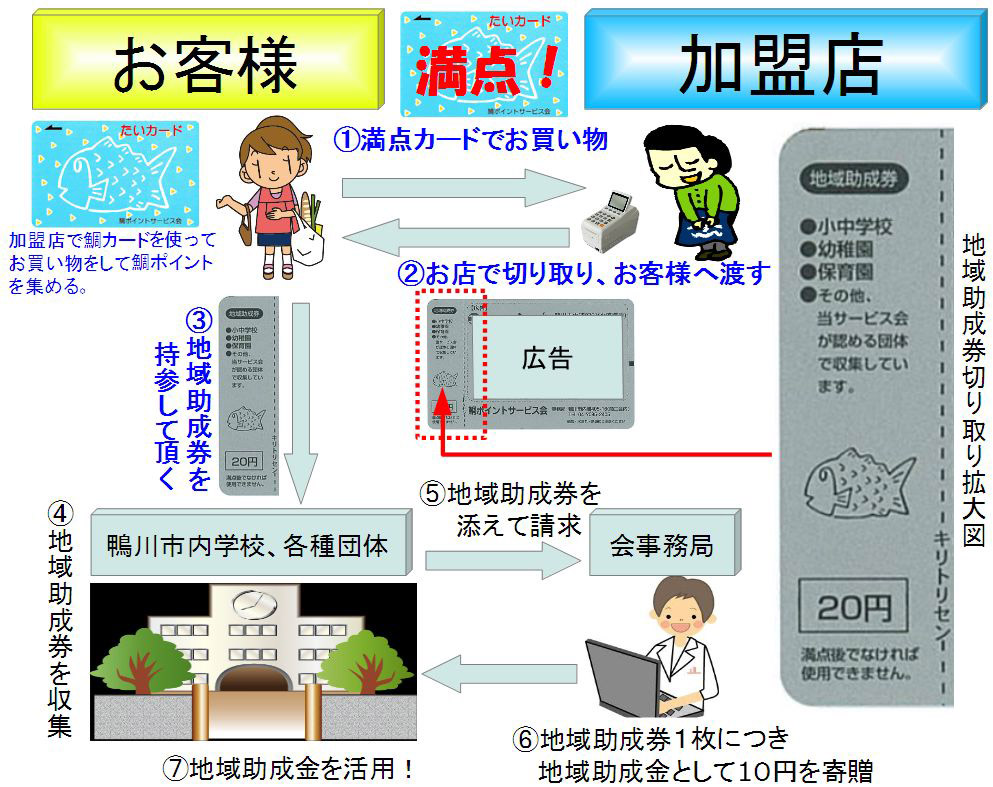 地域・教育助成にご協力いただける方は、満点カードをご利用時に、加盟店で鯛カードの裏面左側(地域助成券の部分)をお受け取りの上、鴨川市内の学校・各種団体へお持ちください。