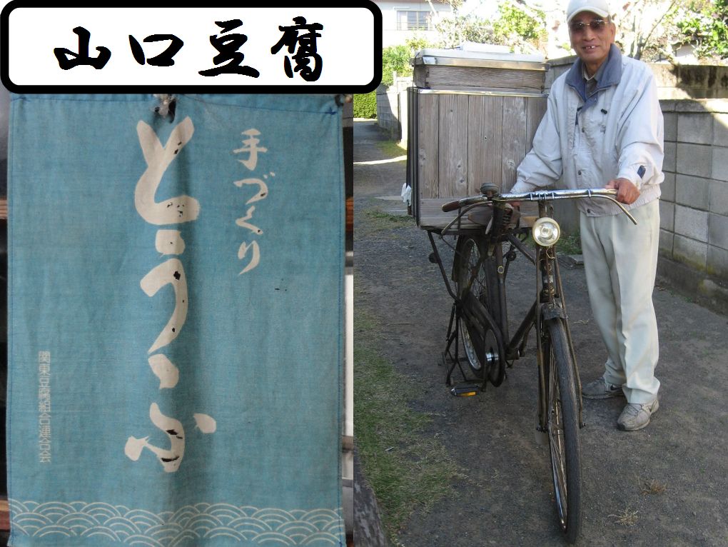 【かもジン:掘り出し物】2011年06月01日発行 8面より転載。昔なつかし、カッコイイ。ヴィンテージ物の自転車で走りまわる雄姿は貝渚の「山口豆腐店」店主の山口勇さん(70 才)。今では珍しいノザワ製自転車の荷台には、特注の豆腐販売用ケースを乗せ、引出しを開けると豆腐・厚揚げ・油揚げ等々、・・・・・。ハンドルにはラッパがぶら下がり、呼止めると、なんともいえない笑顔。豆腐一筋60 年、川口から東条あたりまで自転車で流しながら優しい味を販売しています。見かけたら声をかけてみてください、きっと忘れていた何かを思い出します。