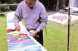萬祝染色士の鮮やかな色とぼかしの腕を見てください。 予約制で工房見学承ります。