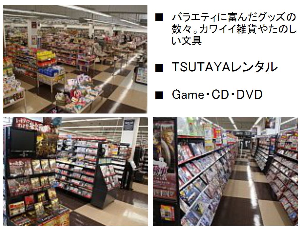 ・書籍・雑貨、文具 バラエティに富んだグッズの数々。カワイイ雑貨やたのしい文具・レンタル TSUTAYAレンタル売場も地域最大級!接客も地域No.1!・Game・CD・DVD Game・CD・DVD売場も地域最大級!!