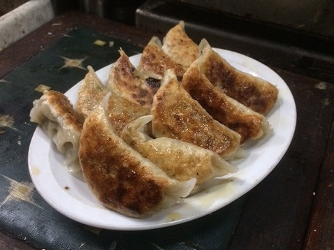 朝から仕込んでいます、ひき肉、にら、キャベツなどが入っている。具沢山の餃子。皮はパリッとしており、中身はジューシーです。