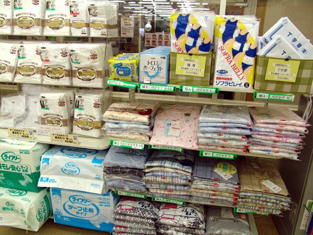患者さまの為に、パジャマ・寝巻きから肌着類まで品揃えしております。また、紙おむつや術後に必要な用品もございます。