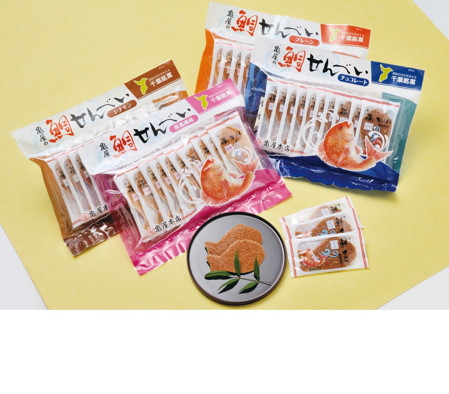 小湊といえば鯛せんべい!というくらい有名でなじみ深い銘菓です。プレーン・チョコレート・シナモン・桜葉・バター・抹茶みるくと6種類の味が揃いました。