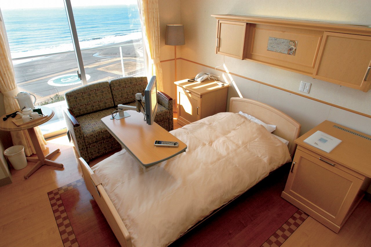 「亀田総合病院」の入院病棟Kタワーは,全室個室のオーシャンビューです。写真のスタンダードなお部屋は21㎡の広さがあり,トイレ・シャワーはもちろん,ソファベッドも装備。
