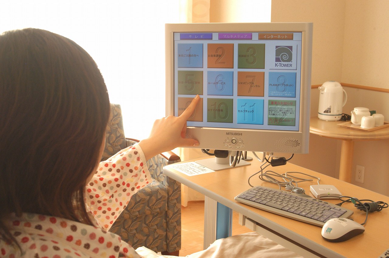 病室のベッドサイドには,インターネットやテレビを楽しめる端末が完備。お食事選択や買い物代行サービスが利用できるほか,「PLANET」というシステムに登録いただければ,ご自身のカルテを自由に閲覧いただけます。