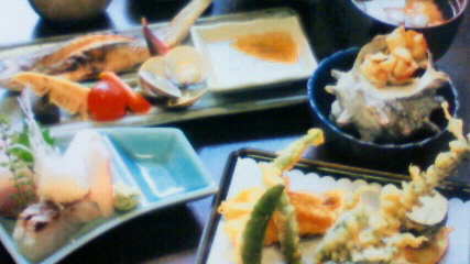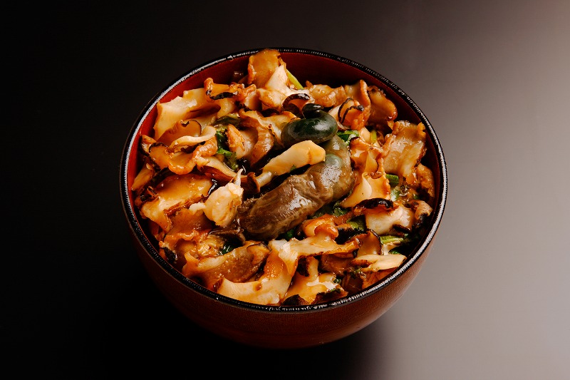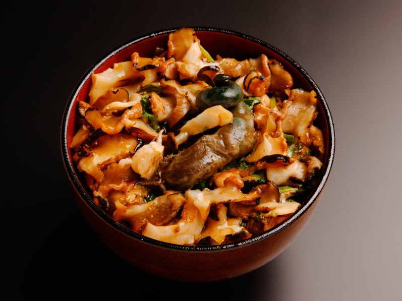 野菜の卵とじと、さざえまるごと1個きもまで使い特製のタレで味をつけた丼です。