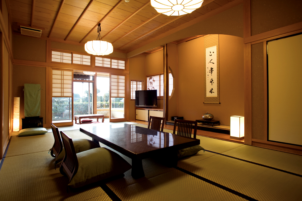 女将の生けた清楚な花を横目に館内を進むと和風庭園が臨める。客室はもとより廊下・階段・脱衣室まで畳敷きにし、和の趣でお迎えいたします。大浴場は男女別に内湯、岩露天の他、貸切風呂も。お料理は季替りの新磯懐石。メイン料理は伊勢海老or鮑orかずさ和牛から選べます。