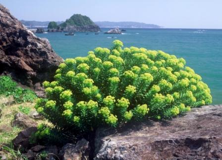 春の訪れを知らせる、磯の岩場から咲くイワタイゲキ。 関東地方南部以西以南に生息する多年草で、海岸の崖地に生え、岩の割れ目を深く地下茎が伸びています。