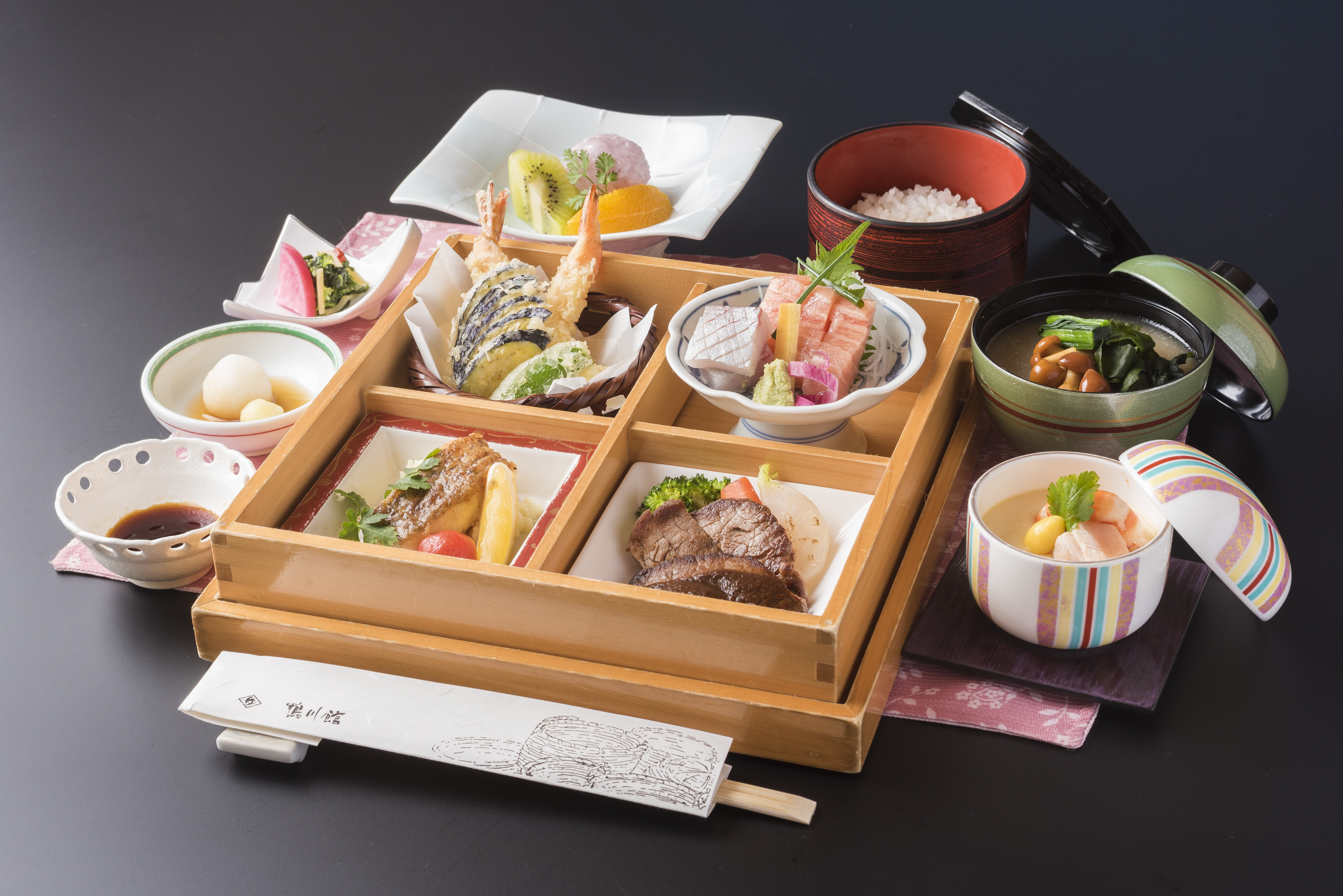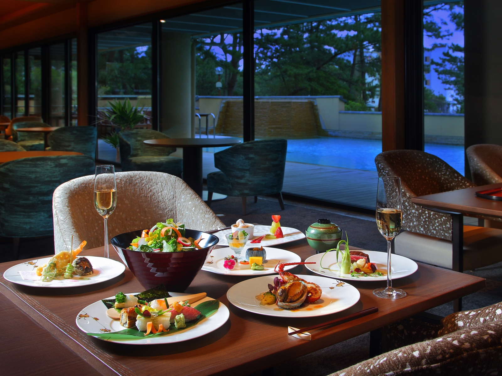 ランチ・ディナータイム共に和食・洋食をご用意。ライブダイニングの鉄板を用いたコースが人気です。また、鴨川館の温泉日帰り入浴(有料)と合せてのご利用もオススメです。