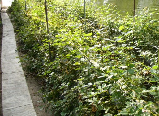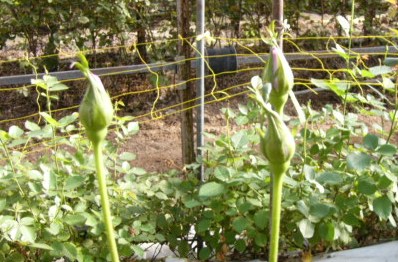 温室の中で育つバラ。つぼみの状態で市場へ出荷します。