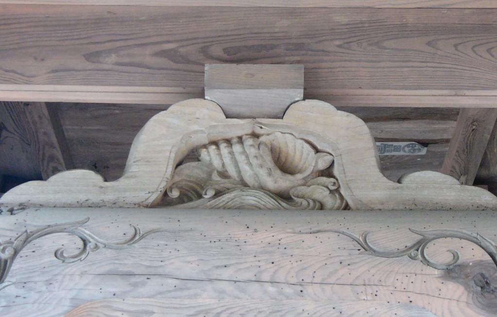 蛙股の中には法螺貝が。真言宗の寺であることからモチーフとして使用したのかもしれない。