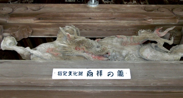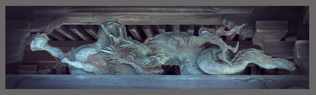 裏面に「武志伊八郎信由」の刻銘があり、市内では「信由」と名乗った作としては最も早い時期の作例になります。長年の風雨の影響のためか、現在では表面がかなり風化しているため、製作当初の状態とはかなり異なっているものと推測できます。左前足で宝珠を握りしめていますが、右前脚の指の先は欠損しています。寺社の建築の正面の向拝(ごはい)を飾る竜としては、伊八の作の中でも最も早い時期に属する作例です。伊八の竜の作風は、これから年を経るごとに大きく変化していきます。