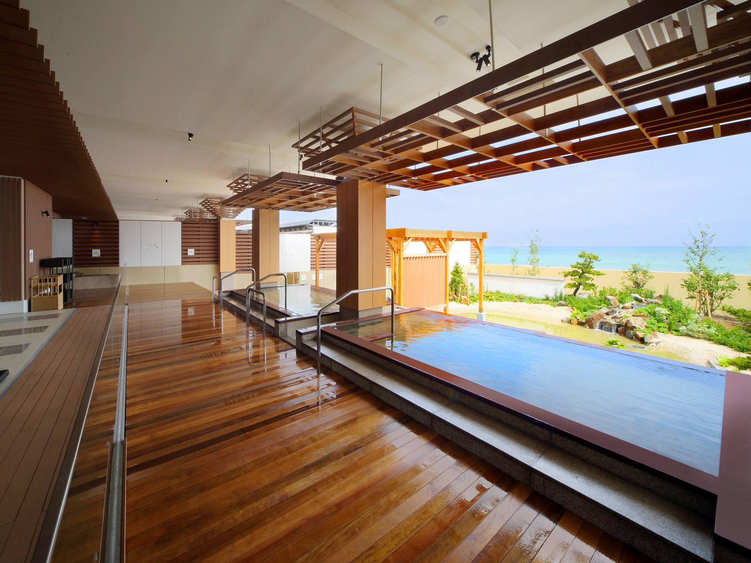 温泉大浴場『湯屋 海の回廊』では海を眺めながら温泉を楽しめる。宿泊はもちろん日帰り入浴も。