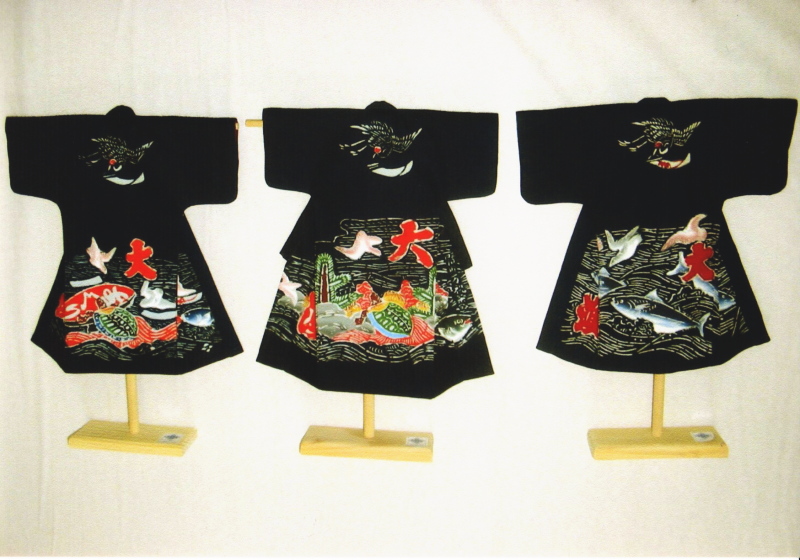 当店の萬祝は、顔料を大豆の汁で溶き、地色は藍瓶にて染めておりますので、使えば使うほど味が出ます。 また、萬祝普及の為、体験教室を開いております。 ぜひ、伝統工芸萬祝染めにトライしてみて下さい!
