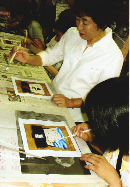 のり付けした布に刷毛筆で色づけをする、万祝染の技術を学びます。1500円コースと3500円(税抜)コース、いずれも要予約です。