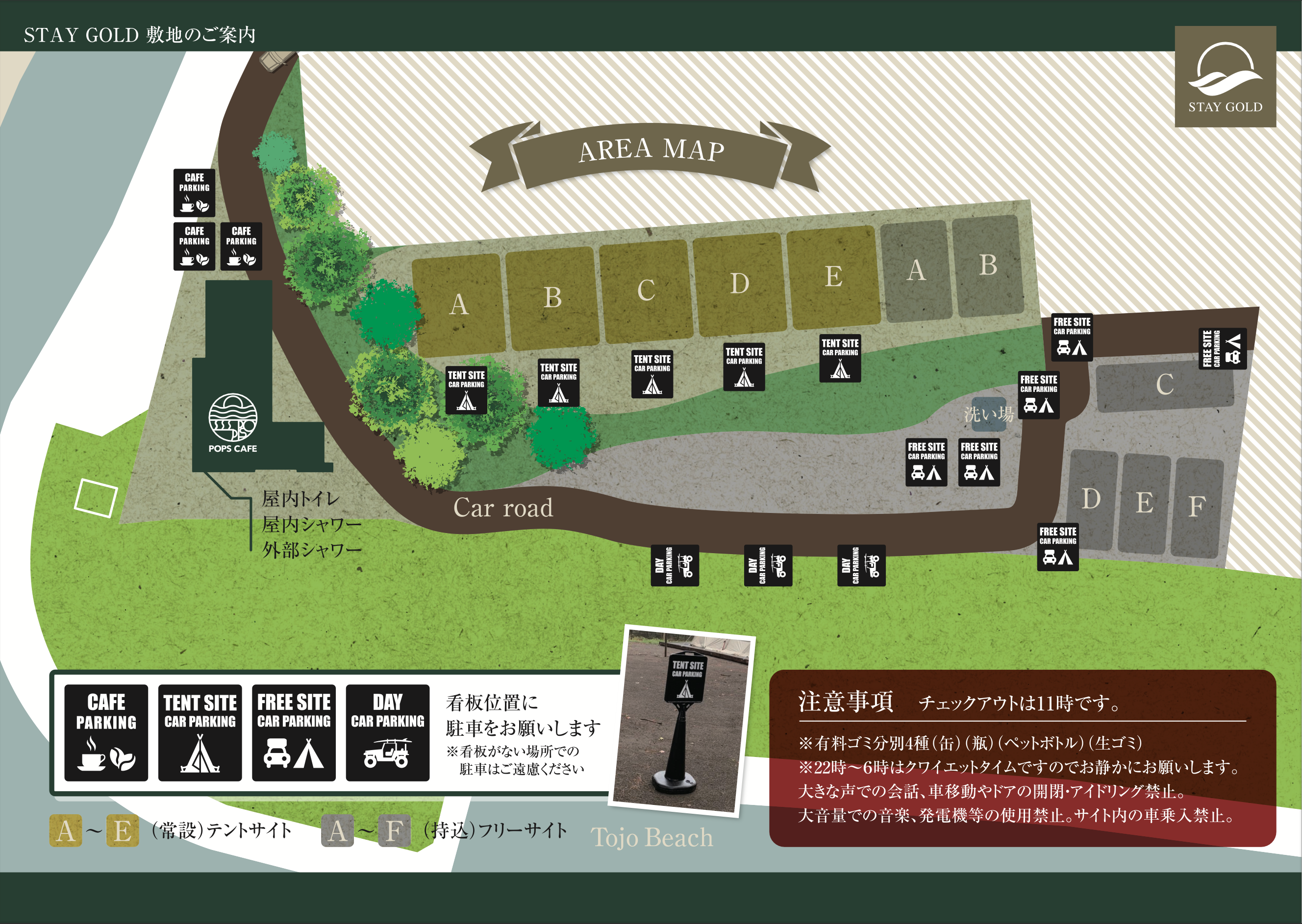 | その他 | オプション BBQセット、朝食セット、チェアー、焼き台、焚火台、シェラフ、蚊取り線香、薪、氷、ガスカセット、ランタン、トング、着火剤 食事場所 CAFE、テント内、屋外テラス |